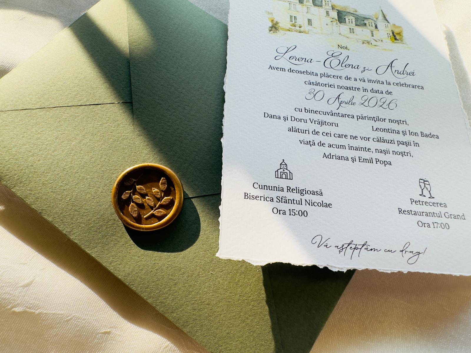 Invitatie manuala carton mat 260 gr, plic verde mat structurat 120gr inclus in pret. Sigiliu auriu inclus