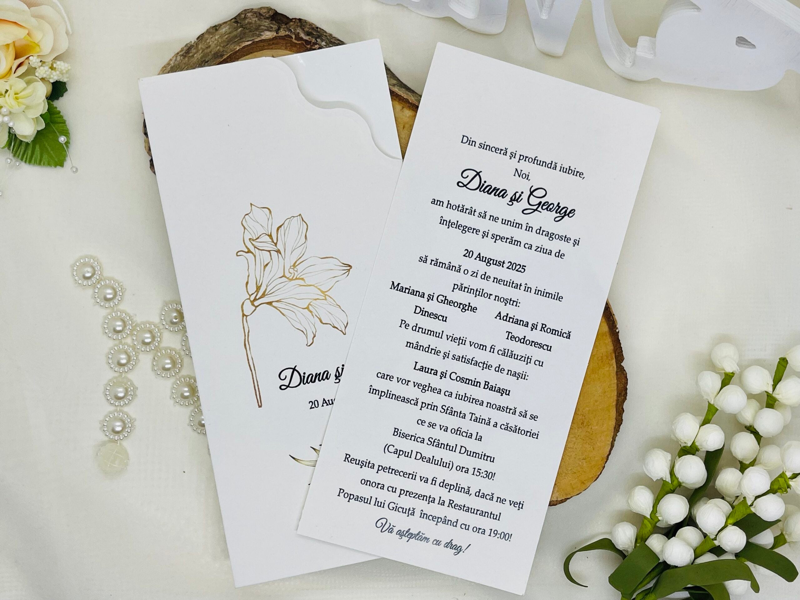 Invitatia se plaiza in trei, se ataseaza cartonas destinat textului. Culoare ivory, nu are plic clasic