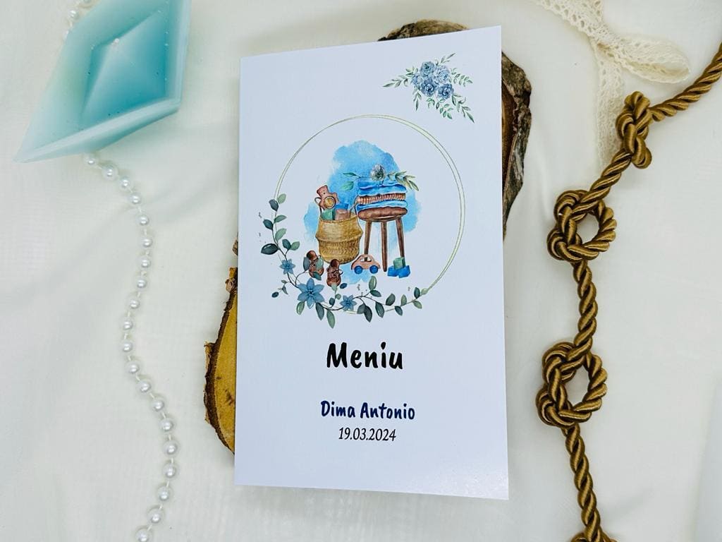 Meniu realizat din cartonas alb 280 gr ce se pliaza in doua