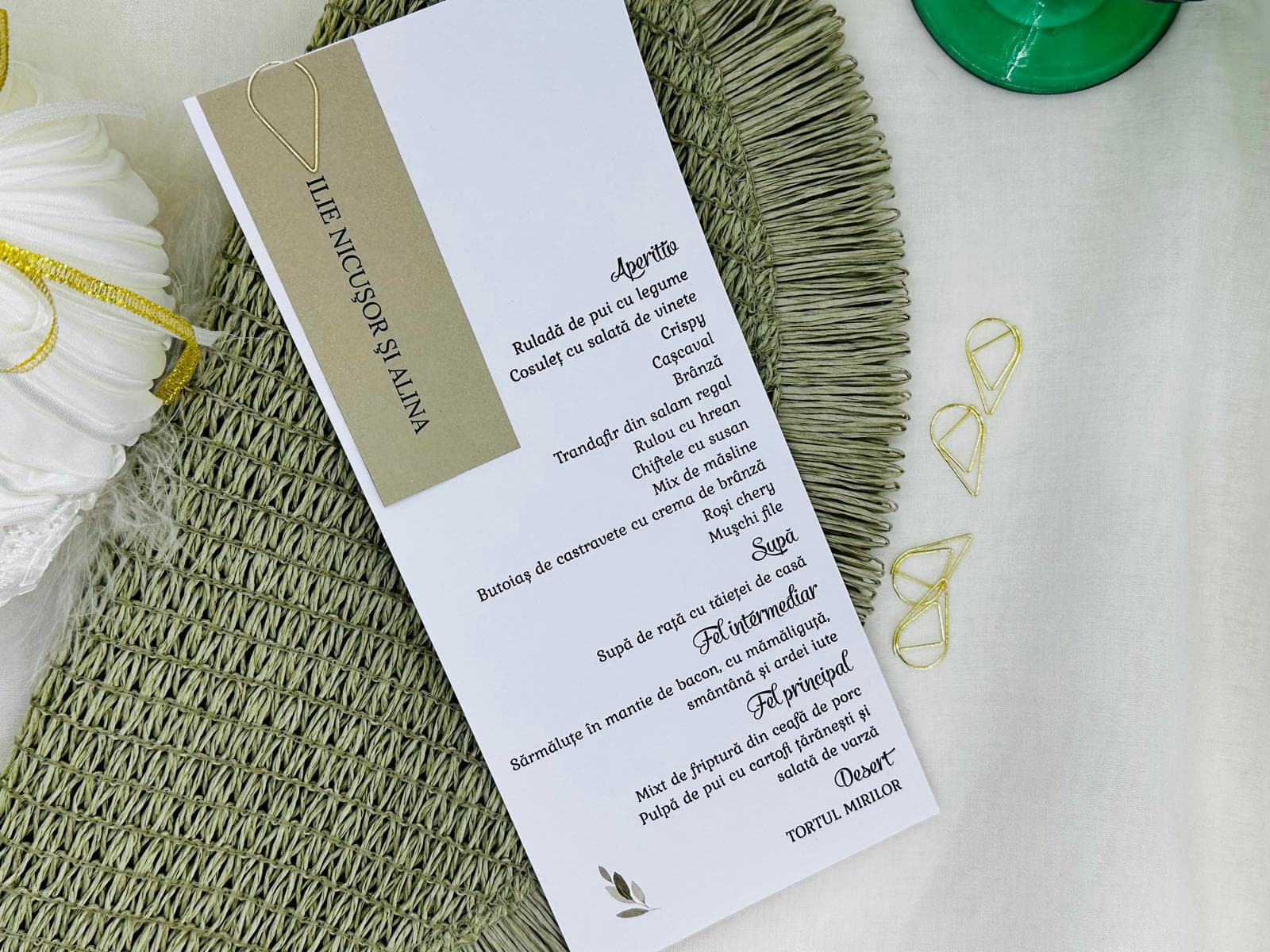 Meniu realizat din carton alb 260 gr, numele invitatului cartonas maroniu accesorizat cu agrafa